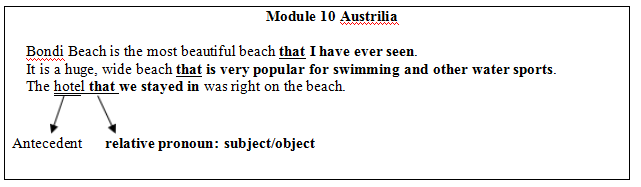 They may share their answers in five minutes. The first sentence means that I have never seen a more beautiful beach than Bondi Beach, the second the beach is a huge and wide one, and it is popular for swimming and other water sports, the third we stayed in a hotel, and the hotel was right on the beach. In these three sentence that refers to the most beautiful beach, a huge, wild beach and the hotel respectively. The function of the relative pronoun is to refer to the noun or pronoun before it.